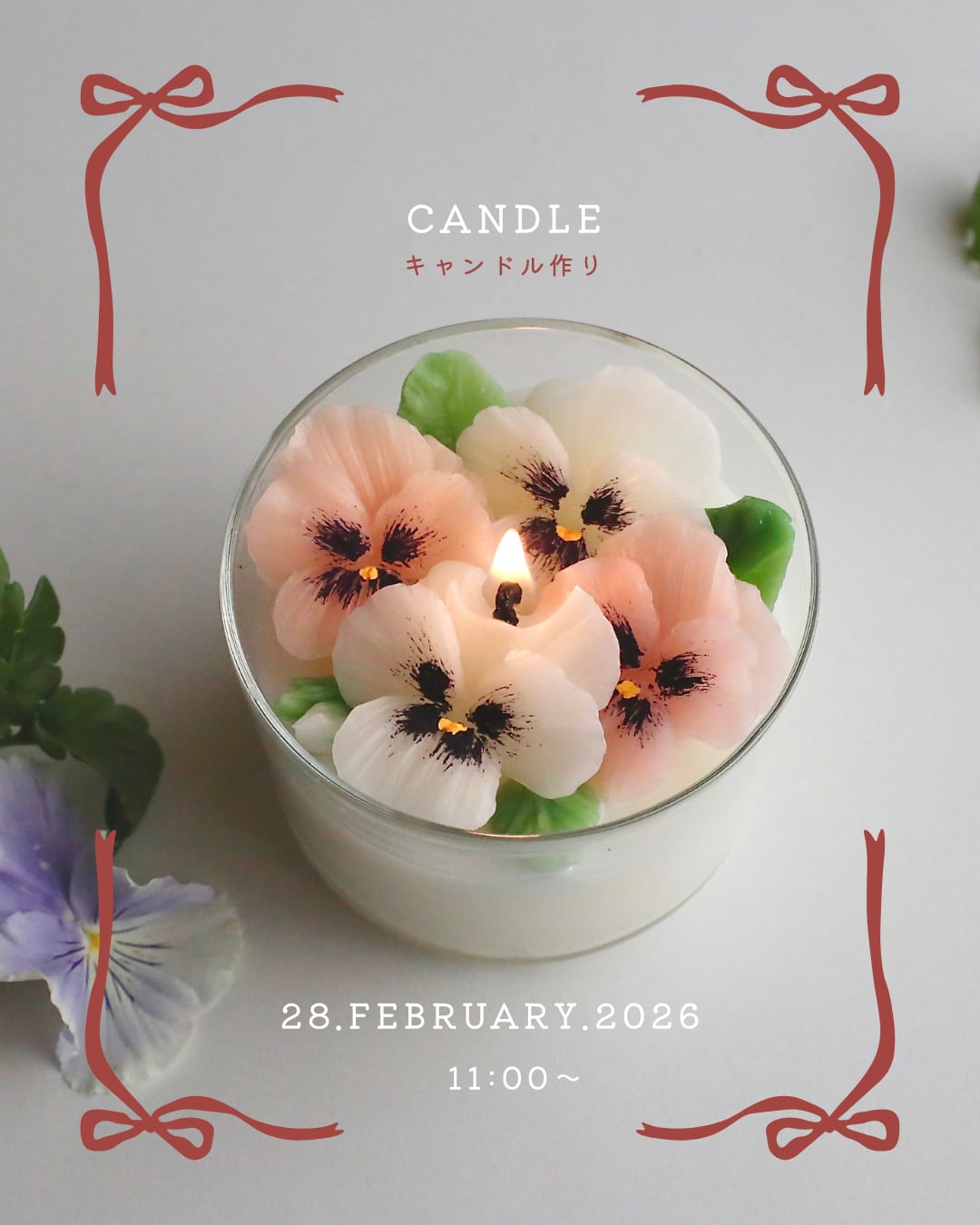 福岡県福岡市中央区谷にある「ハナジタク」さんにて、キャンドルレッスンを開催させていただきます。ビオラのグラスキャンドルを手作りしてみませんか?2026年2月28日(土)11時〜。ハナジタクさんのホームページからお申込みいただけます。追記2026.1.17ご予約は満席となりました。お申込みいただきました皆様、誠にありがとうございます。当日はお気をつけてお越しくださいませ。